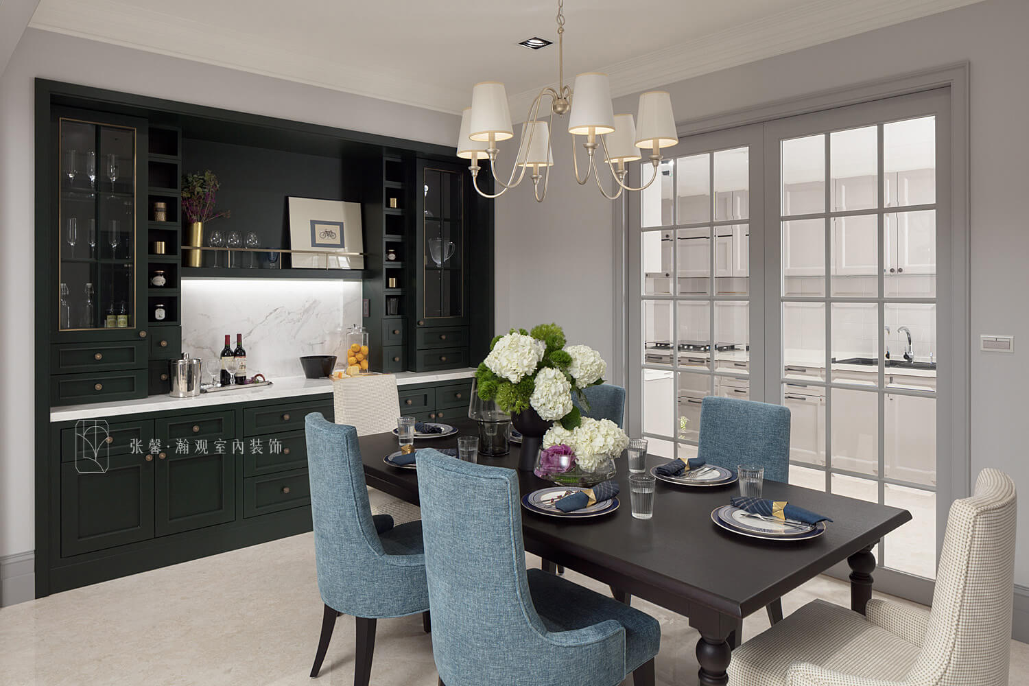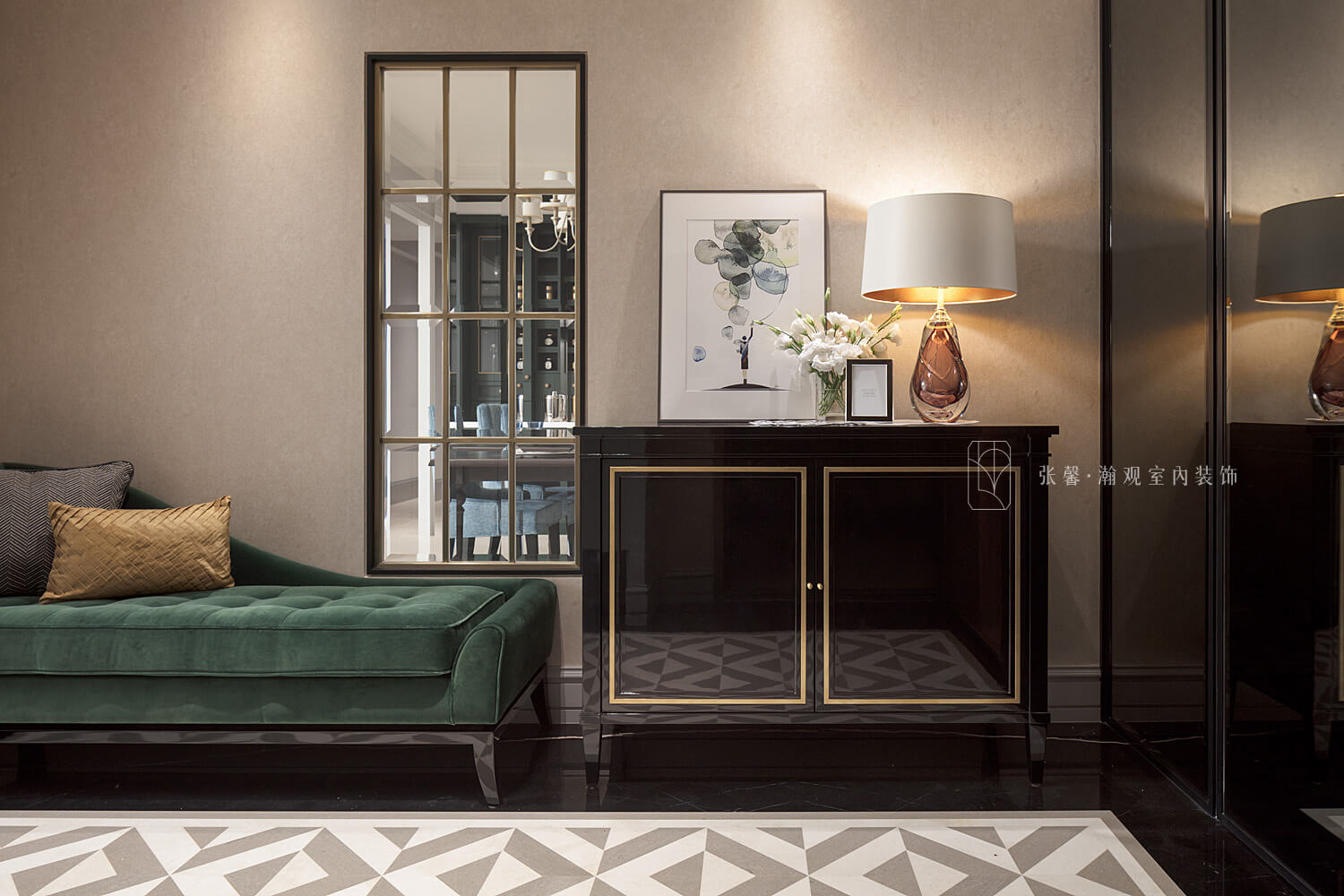 尤其在书房方面,因为我下班回来比较晚,几乎每天都要拨时间来办公,书房的部份很沉稳,让我整个心情都放松下来;餐厅布置了一个深墨绿色餐柜,那个颜色很巧妙就完全融入在这个空间,又能提升整个空间的色彩跟色调,谢谢张馨团队帮我们完成这样的一个空间设计。